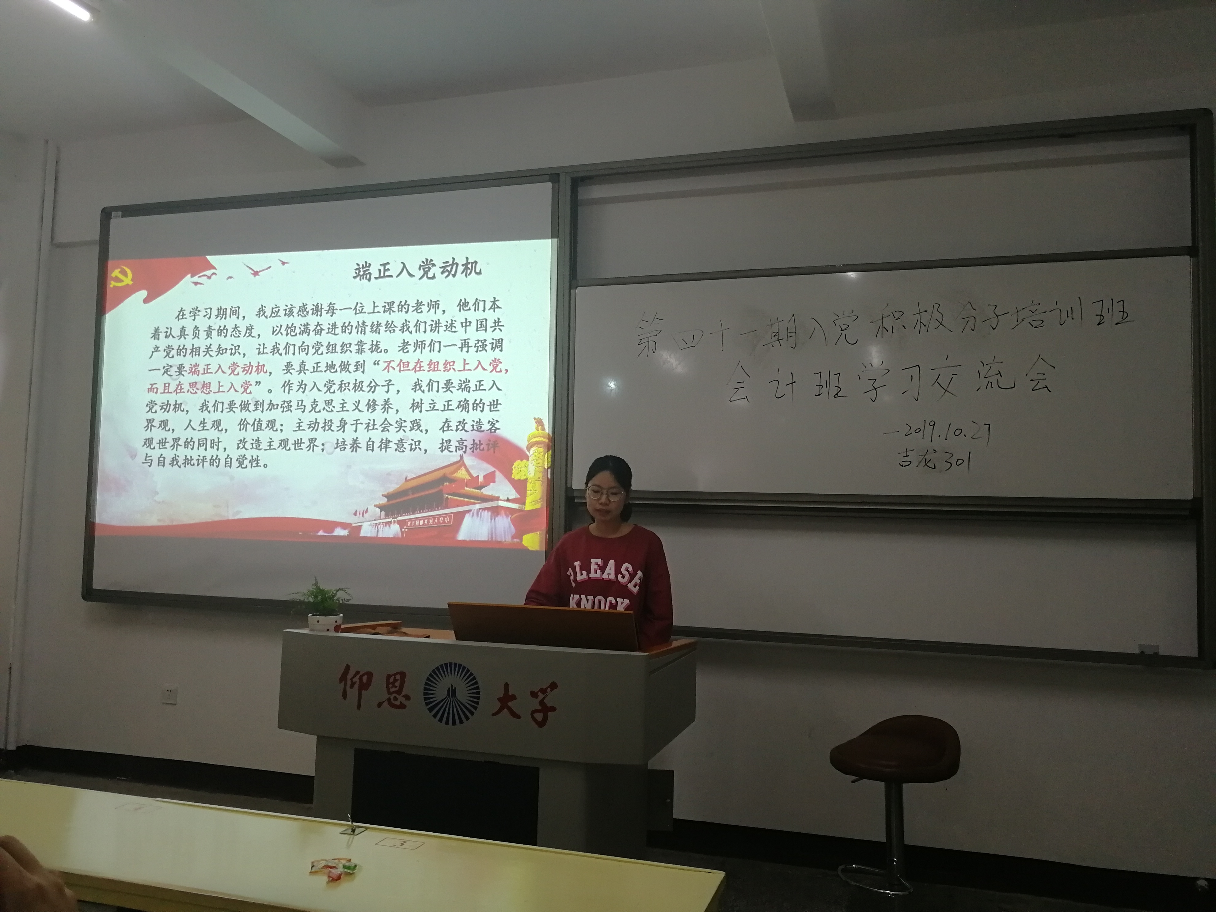2019年10月27日下午2:00,kaiyun体育网页登录入口学生第一党支部于吉龙楼301开展“kaiyun体育网页登录入口第41期入党积极分子培训班(会计班)学习交流会”,共有37位入党积极分子参加此次的学习交流会。